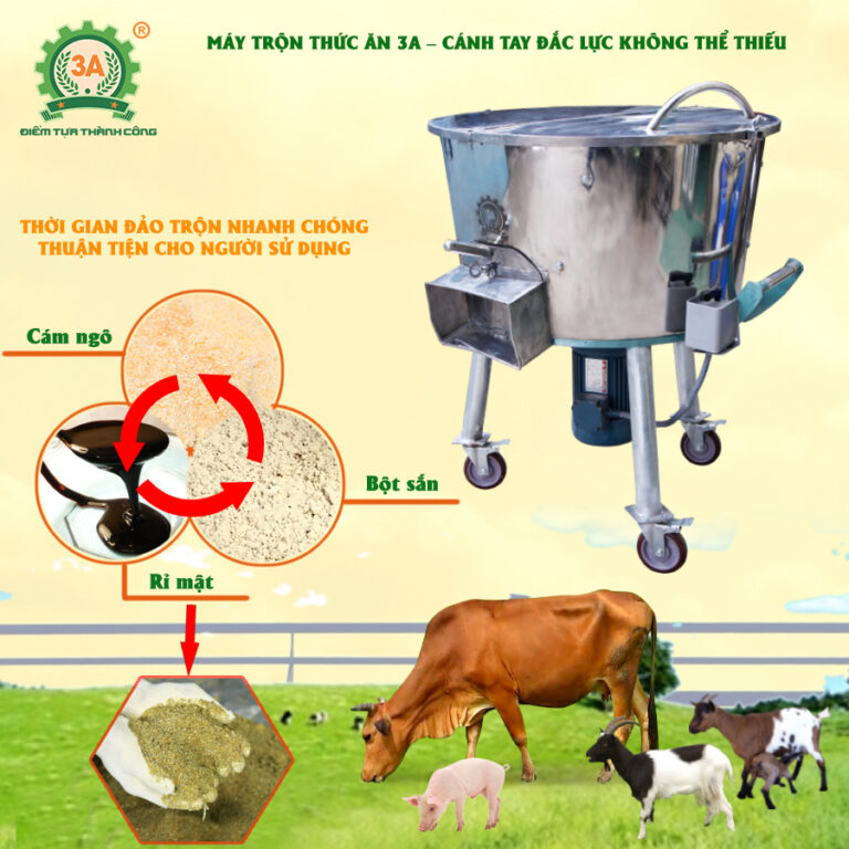 Thời gian lý tưởng là 7–10 phút/mẻ trộn. Việc cài đặt đúng thời gian giúp tiết kiệm năng lượng mà vẫn đạt độ đồng nhất cao. - Máy trộn thức ăn 3A có phù hợp với hộ chăn nuôi nhỏ không?