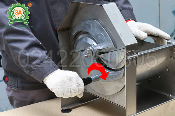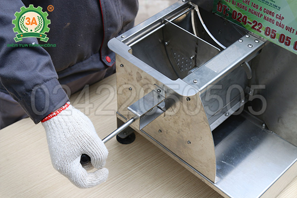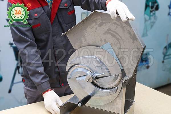 Sau khi cho nguyên liệu vào cửa nạp bạn chỉ cần dùng tay quay, quay đều theo chiều kim đồng hồ để thái cắt các lát củ quả. Tốc độ quay của tay quyết định năng suất đầu ra của sản phẩm. nếu bạn quay nhanh thì sản phẩm ra nhanh và ngược lại.