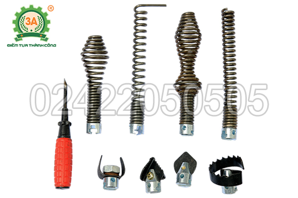 Loại máy phổ biến nhất hiện nay chính là máy thông cống lò xo. “Lò xo” ở đây không phải là loại lò xo co giãn, mà là một sợi dây cáp thép được xoắn lại với nhau, vừa đủ cứng để truyền lực xoay, vừa đủ mềm dẻo để luồn lách qua các đoạn cong của đường ống. Tùy vào loại tắc nghẽn, người ta có thể thay các loại đầu thông khác nhau: đầu hình mũi giáo để khoan, đầu hình răng cưa để cắt rễ cây, đầu hình móc câu để lôi tóc và giẻ lau…