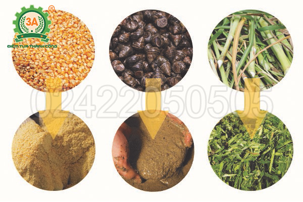- Nghiền nhuyễn: Thân chuối, bèo, ốc, cua… (350kg/h)
