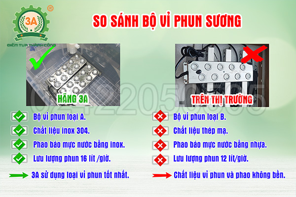 | 3 | Bộ vỉ phun sương 20 mắt | – Bộ vỉ phun loại A làm bằng chất liệu inox 304. – Phao cảnh báo mực nước trên vỉ là phao inox. – Vỉ phun sương mẫu inox có nhiều loại: có loại tạo ra 12kg sương/h; có loại tạo ra 16kg sương/h. Mã vỉ phun 20 mắt của hãng 3A được chọn là loại tạo ra 8kg sương/giờ cho lượng sương nhiều hơn các loại vỉ khác. → Hiện 3A đang sử dụng loại vỉ phun tốt nhất trên thị trường.