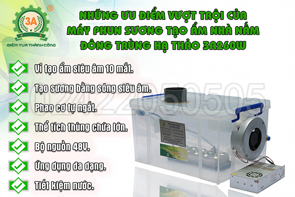 Với nhiều ưu điểm vượt trội, ngay từ khi mới được giới thiệu trên thị trường máy tạo ẩm nhà nấm đông trùng hạ thảo 3A260W đã được nhiều đối tác tin tưởng lựa chọn sử dụng và mang lại hiệu quả cao, tiết kiệm được công sức, thời gian và chi phí trong nuôi trồng đông trùng hạ thảo. Bà con hãy nhanh tay liên hệ với hãng 3A mua ngay thiết bị này để có một môi trường nuôi cấy đông trùng hạ thảo lý tưởng.