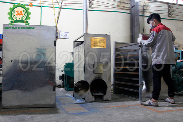 Nguyên lý hoạt động: Sau khi nhiên liệu được đốt trong buồng đốt, nguồn nhiệt sinh ra sẽ được quạt thổi lan rộng toàn buồng sấy, giúp sấy khô nguyên liệu.